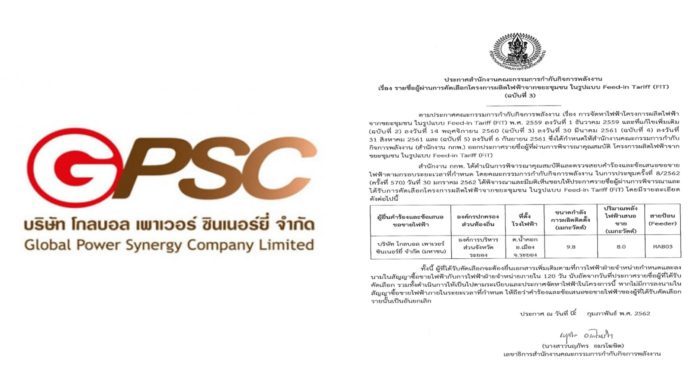 คณะกรรมการกำกับกิจการพลังงาน (กกพ.)ออกประกาศ ให้บริษัท โกลบอล เพาเวอร์ ซินเนอร์ยี่ จำกัด (มหาชน) หรือ GPSC ผ่านการพิจารณาคุณสมบัติโครงการผลิตไฟฟ้าขยะชุมชน เสนอขายไฟ 8 เมกะวัตต์ ในจ.ระยอง จ่ายไฟฟ้าเชิงพาณิชย์ปี 2564 นอกจากนี้ยังเตรียมออกประกาศรับซื้อไฟฟ้าขยะชุมชน จากผู้ผลิตไฟฟ้ารายเล็ก(SPP)ไม่ต่ำกว่า 50 เมกะวัตต์ ในเดือน มี.ค.2562