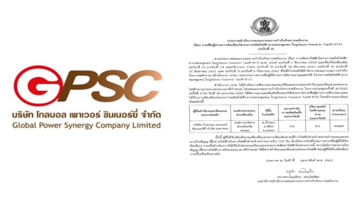 ผู้สื่อข่าวศูนย์ข่าวพลังงาน(Energy News Center-ENC) รายงานว่า สำนักงานคณะกรรมการกำกับกิจการพลังงาน (สำนักงาน กกพ.) ได้ออกประกาศผ่านทางเว็บไซต์ กกพ. ประกาศรายชื่อผู้ผ่านการพิจารณาคุณสมบัติ โครงการผลิตไฟฟ้าจากขยะชุมชน ในรูปแบบ Feed-in Tariff (FiT) หรือ Quick Win Projects อีก 1 ราย คือ บริษัท โกลบอล เพาเวอร์ ซินเนอร์ยี่ จำกัด (มหาชน) หรือ GPSC ซึ่งร่วมกับองค์การบริหารส่วนจังหวัดระยอง ดำเนินโครงการก่อสร้างโรงไฟฟ้าที่ ต.น้ำคอก อ.เมือง จ.ระยอง ขนาดกำลังการผลิตติดตั้ง 9.8 เมกะวัตต์ และมีปริมาณเสนอขายไฟฟ้า 8 เมกะวัตต์