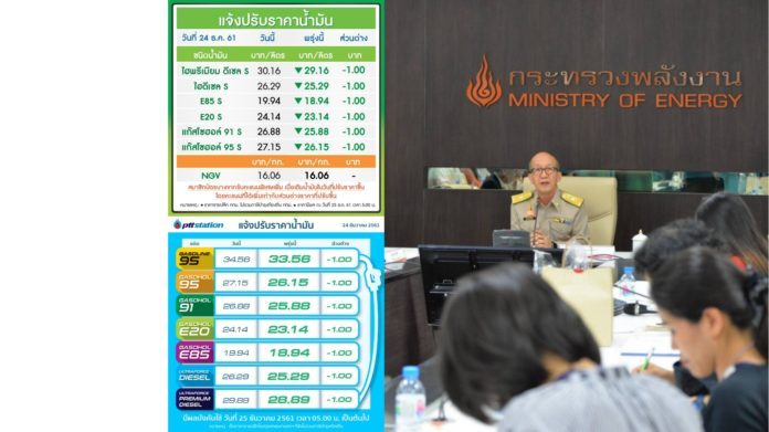 กบง.มีมติลดส่งเงินเข้ากองทุนน้ำมันและขอความร่วมมือผู้ค้าน้ำมันลดค่าการตลาด ส่งผลในราคาน้ำมันขายปลีกทั้งกลุ่มเบนซินและดีเซลปรับลดลง1บาทต่อลิตรมีผลตั้งแต่25ธ.ค.2561 ก่อนช่วงเทศกาลปีใหม่ ในขณะที่มาตรการช่วยเหลือวินมอเตอร์ไซค์ที่ถือบัตรสวัสดิการแห่งรัฐให้ใช้ราคาน้ำมันแก๊สโซฮอล์ถูกกว่าปกติ3บาทต่อลิตรยังต้องชะลอการดำเนินการไปก่อนเพราะเป็นช่วงน้ำมันขาลง