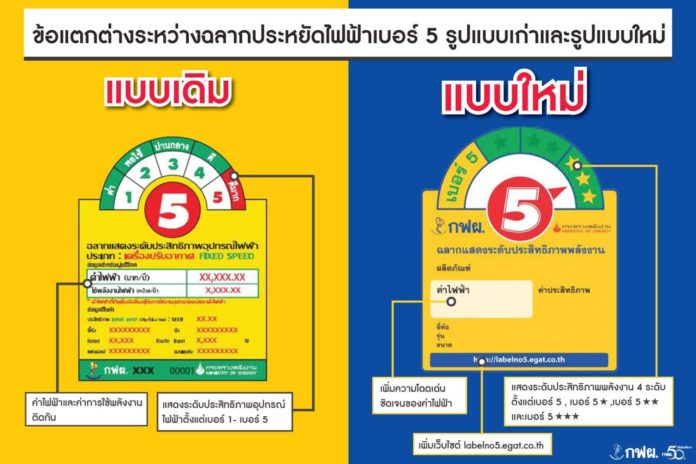 หน้าตาของฉลากประหยัดไฟฟ้าเบอร์ 5 รูปแบบใหม่ มีข้อแตกต่างจากกฉลากเก่า ที่สำคัญๆ คือ ฉลากใหม่จะเพิ่มความชัดเจนของค่าไฟฟ้า และจะแสดงระดับประสิทธิภาพของค่าพลังงาน 4 ระดับ คือ เบอร์ 5, เบอร์ 5 ★, เบอร์ 5 ★★ และ เบอร์ 5 ★★★ รวมถึงเพิ่มที่อยู่เว็บไซต์เพื่อให้ผู้บริโภคเข้าไปสืบค้นข้อมูลเพิ่มเติมได้