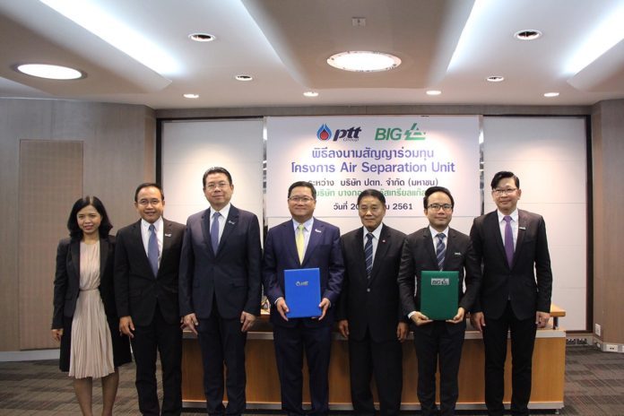 นายชาญศิลป์ ตรีนุชกร ประธานเจ้าหน้าที่บริหารและกรรมการผู้จัดการใหญ่ บริษัท ปตท. จำกัด (มหาชน)เปิดเผยว่า เมื่อเร็วๆ นี้ ปตท.ได้ลงนามสัญญาร่วมทุนโครงการหน่วยแยกอากาศ โดยใช้พลังงานความเย็นเหลือทิ้งจากก๊าซธรรมชาติเหลว หรือ แอลเอ็นจี (LNG) ในการผลิตก๊าซอุตสาหกรรม หรือ Air Separation Unit(ASU) ร่วมกับ บริษัท บางกอกอินดัสเทรียลแก๊ส จำกัด หรือ บีไอจี (BIG) ก๊าซอุตสาหกรรมชนิดต่างๆ ประกอบด้วย ไนโตรเจน ออกซิเจน และอาร์กอน เพื่อรองรับความต้องการใช้ในโรงงานอุตสาหกรรม และใช้ประโยชน์ทางการแพทย์ ที่มีความต้องการ และขยายตัวสูงขึ้นอย่างต่อเนื่องในอนาคต โดยโครงการดังกล่าวตั้งอยู่ในนิคมอุตสาหกรรมมาบตาพุด จ.ระยอง ใช้เงินลงทุนกว่า 1,500 ล้านบาท กำลังผลิตประมาณ 450,000 ตันต่อปี คาดว่าจะสามารถดำเนินการผลิตเชิงพาณิชย์ได้ภายในปี 2564 นับเป็นการสนับสนุนนโยบายรัฐในโครงการระเบียงผลไม้ภาคตะวันออก (Eastern Fruit Corridor : EFC)