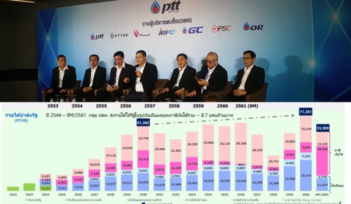 กลุ่มปตท.เปิดตัวเลขรายได้ส่งรัฐนับตั้งแต่แปรรูปเข้าตลาดหลักทรัพย์แห่งประเทศไทย เมื่อปี 2544 จนถึงไตรมาสที่ 3 ปี 2561 มีมูลค่าสูงถึง 8.7 แสนล้านบาท โดยปี 2560 เป็นปีที่นำส่งรายได้มากสุด 71,281 ล้านบาท