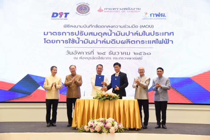 กระทรวงพาณิชย์ลงนาม MOU กับกระทรวงพลังงาน แล้วเมื่อวันที่ 25 ธ.ค.2561 เพื่อขับเคลื่อนมาตรการปรับสมดุลน้ำมันปาล์มในประเทศ โดยการใช้น้ำมันปาล์มดิบผลิตกระแสไฟฟ้า ที่ กฟผ.และกระทรวงพาณิชย์จะช่วยกันแบกรับภาระต้นทุนที่สูงขึ้นประมาณ1,354ล้านบาท