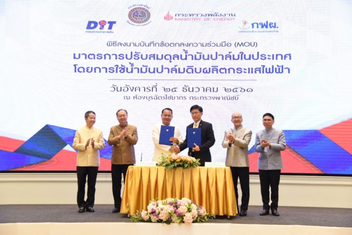 ในวันนี้ (25 ธันวาคม 2561) นายสนธิรัตน์ สนธิจิรวงศ์ รัฐมนตรีว่าการกระทรวงพาณิชย์ และ นาย ศิริ จิระพงษ์พันธ์ รัฐมนตรีว่าการกระทรวงพลังงาน เป็นประธานร่วมในพิธีลงนามบันทึกข้อตกลงความร่วมมือ (MOU) มาตรการปรับสมดุลน้ำมันปาล์มในประเทศ โดยการใช้น้ำมันปาล์มดิบผลิตกระแสไฟฟ้า ระหว่าง นายวิชัย โภชนกิจ อธิบดีกรมการค้าภายใน และนายวิบูลย์ ฤกษ์ศิระทัย ผู้ว่าการการไฟฟ้าฝ่ายผลิตแห่งประเทศไทย (กฟผ.) โดยมี นายบุณยฤทธิ์ กัลยาณมิตร ปลัดกระทรวงพาณิชย์ และนายกุลิศ สมบัติศิริ ปลัดกระทรวงพลังงานร่วมเป็นสักขีพยาน ณ ห้องบุรฉัตรไชยากร กระทรวงพาณิชย์