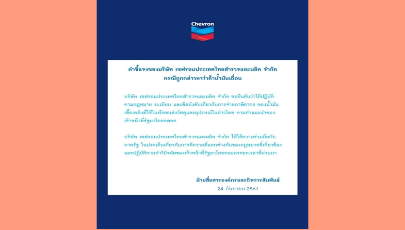 บริษัท เชฟรอนประเทศไทยสำรวจและผลิต จำกัด ออกแถลงการณ์คำชี้แจงของบริษัทฯ กรณีถูกกล่าวหาว่าค้าน้ำมันเถื่อน โดยยืนยันว่าได้ปฏิบัติตามกฎหมาย ระเบียบ และข้อบังคับเกี่ยวกับการจ่ายภาษีอากร ของน้ำมันเชื้อเพลิงที่ใช้ในเรือขนส่งวัสดุและอุปกรณ์ในอ่าวไทย ตามคำแนะนำของเจ้าหน้าที่รัฐมาโดยตลอด