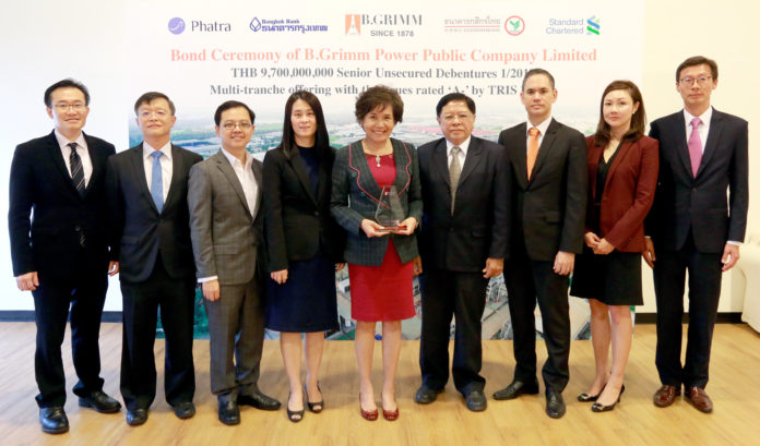นางปรียนาถ สุนทรวาทะ (ที่ 5 จากซ้าย) ประธานเจ้าหน้าที่บริหาร บมจ.บี.กริม เพาเวอร์ ร่วมด้วย นายประเสริฐ ดีจงกิจ Senior Vice President และผู้จัดการ ผ่ายทุนธนกิจ สายวานิชธนกิจ ธนาคารกรุงเทพ จำกัด (มหาชน) นายปัญญา คงคาไพศาล ผู้อำนวยการฝ่ายอาวุโส สายงานธุรกิจลูกค้าบรรษัท ธนาคารกสิกรไทย จำกัด (มหาชน) นายปรีชา เตชรุ่งเรืองชัย ประธานสายตลาดการเงิน กลุ่มธุรกิจการเงินเกียรตินาคินภัทร และ คุณเกตรัตน์ วิริยประไพกิจ รองกรรมการผู้จัดการใหญ่ หัวหน้าสายงานตลาดเงินและตลาดทุน ธนาคารสแตนดาร์ดชาร์เตอร์ด (ไทย) จำกัด (มหาชน) ในฐานะผู้รับประกันการจัดจำหน่ายร่วม (joint lead underwriters) ร่วมฉลองความสำเร็จในการจัดจำหน่ายหุ้นกู้ไม่ด้อยสิทธิและไม่มีประกันมูลค่า 9,700 ล้านบาท ประกอบด้วยหุ้นกู้อายุ 2 ปี จำนวน 500 ล้านบาท หุ้นกู้อายุ 3 ปี จำนวน 2,700 ล้านบาท หุ้นกู้อายุ 5 ปี จำนวน 1,500 ล้านบาท และ หุ้นกู้อายุ 10 ปี จำนวน 5,000 ล้านบาท ซึ่งได้รับการตอบรับที่ดีจากผู้ลงทุนสถาบัน และผู้ลงทุนรายใหญ่ สะท้อนให้เห็นความเชื่อมั่นในบริษัท ทั้งด้านการดำเนินงานที่แข็งแกร่ง ทีมผู้บริหารที่มีประสบการณ์สูงและยาวนานในธุรกิจ ความเป็นผู้นำด้านการดำเนินธุรกิจอย่างมั่นคงในประเทศไทยมายาวนานกว่า 140 ปี และจะเติบโตคู่กับประเทศไทยต่อไป ณ ห้องประชุมใหญ่ อาคาร ดร.เกฮาร์ด ลิงค์ เมื่อเร็วๆ นี้
